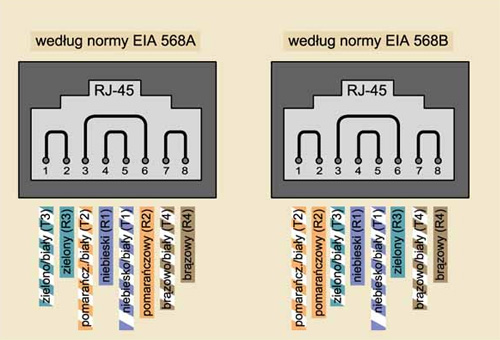 W zależności od normy wyróżnia się dwie podstawowe techniki łączenia par przewodów miedzianych ze złączem RJ-45: