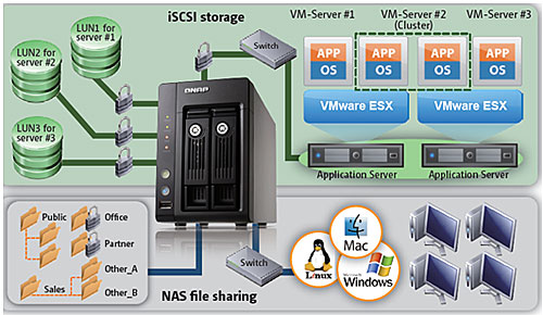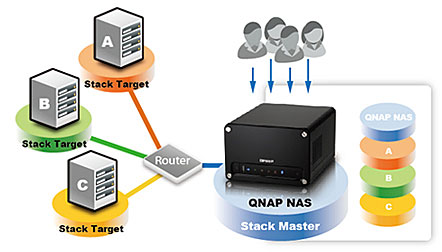 Funkcja "Virtual Disk Drive" dodaje do serwera elastyczną funkcję rozbudowy pojemności serwera. Dzięki wykorzystaniu wbudowanego inicjatora iSCSI serwer może być połączony do innych urządzeń iSCSI target (np. innych serwerów QNAP) i automatycznie włączyć je do swoich zasobów jako dyski wirtualne. Będą one widoczne w systemie jako pojedyncze wolumeny w serwerze. W ten sposób może być podłączonych do 8 serwerów (dysków wirtualnych) którymi serwer zarządza jako tzw master.