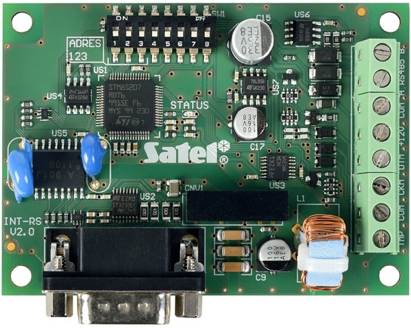 INT-RS - konwerter danych stosowany z centralami alarmowymi z serii INTEGRA. Moduł INT-RS jest obsługiwany przez centrale z oprogramowaniem 1.06 lub nowszym. Urządzenie konwertuje dane przesyłane magistralą manipulatorów na standard magistrali szeregowej RS-232.