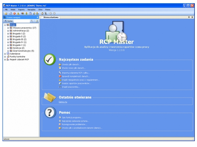 Raporty: Grupy pracowników, Pracownicy, Kalendarze, Punkty kontrolne, Rejestr zdarzeń RCP, Raporty czasu pracy, Wymiary urlopów, Indywidualne kalendarze itp.