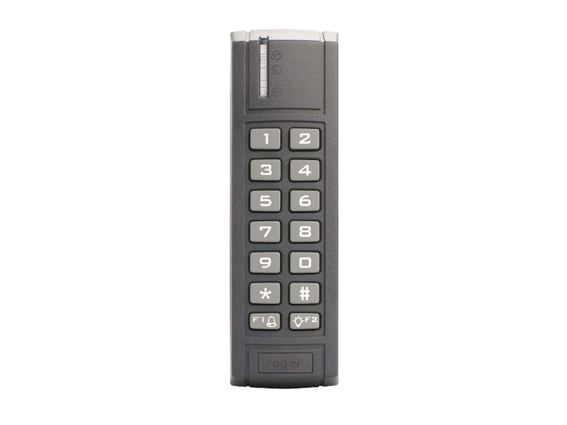 PRT12LT-G Roger to wysokiej klasy czytnik kart zbliżeniowych z wbudowaną klawiaturą, który cechuje się niezawodną pracą oraz podwyższoną funkcjonalnością. Prezentowany produkt należy do serii czytników PRTxxLT. Seria PRTxxLT to grupa terminali dostępu zaprojektowana do współpracy z kartami zbliżeniowymi standardu EM 125 kHz. Czytnik zbliżeniowy posiada silikonową klawiaturę grawerowaną laserowo z podświetleniem z dodatkowymi dwoma klawiszami funkcyjnymi (np. dzwonek, lampka)