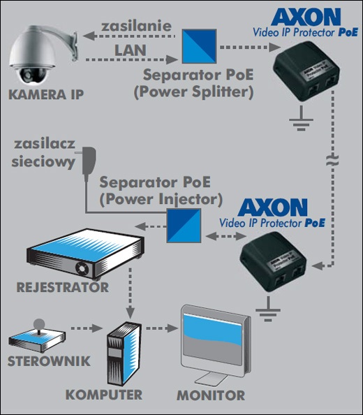 Prezentowany produkt posiada dwa tory: tor przesyłania oraz tor zasilania. AXON Video IP Protector PoE zapewnia zabezpieczenie przeciwprzepięciowe dla obu torów. Urządzenie skutecznie odprowadza ładunek do „ziemi" oraz chroni linie pomiędzy sobą w obrębie pary przewodów. W celu zwiększenie obciążalności toru zasilania linia 4 jest zwarta z 5, a linia 7 z 8. Warunkiem poprawnej pracy urządzenia jest podłączenie go do uziemienia (nie podłączać do piorunochronu) lub przewodu ochronnego PE sieci elektrycznej.