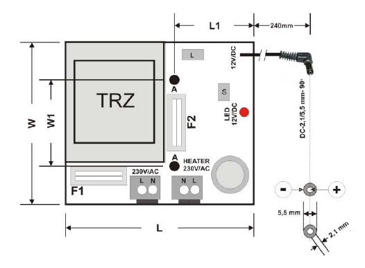 AWZ522 - zasilacz służy do zasilania urządzeń w systemach telewizji przemysłowej CCTV. AWZ522 stosuje się do zasilania kamer montowanych w zewnętrznych obudowach z godnych z otworami montażowymi A-A oraz wymiarami. Posiada dwa wyjścia przeznaczone do zasilania: